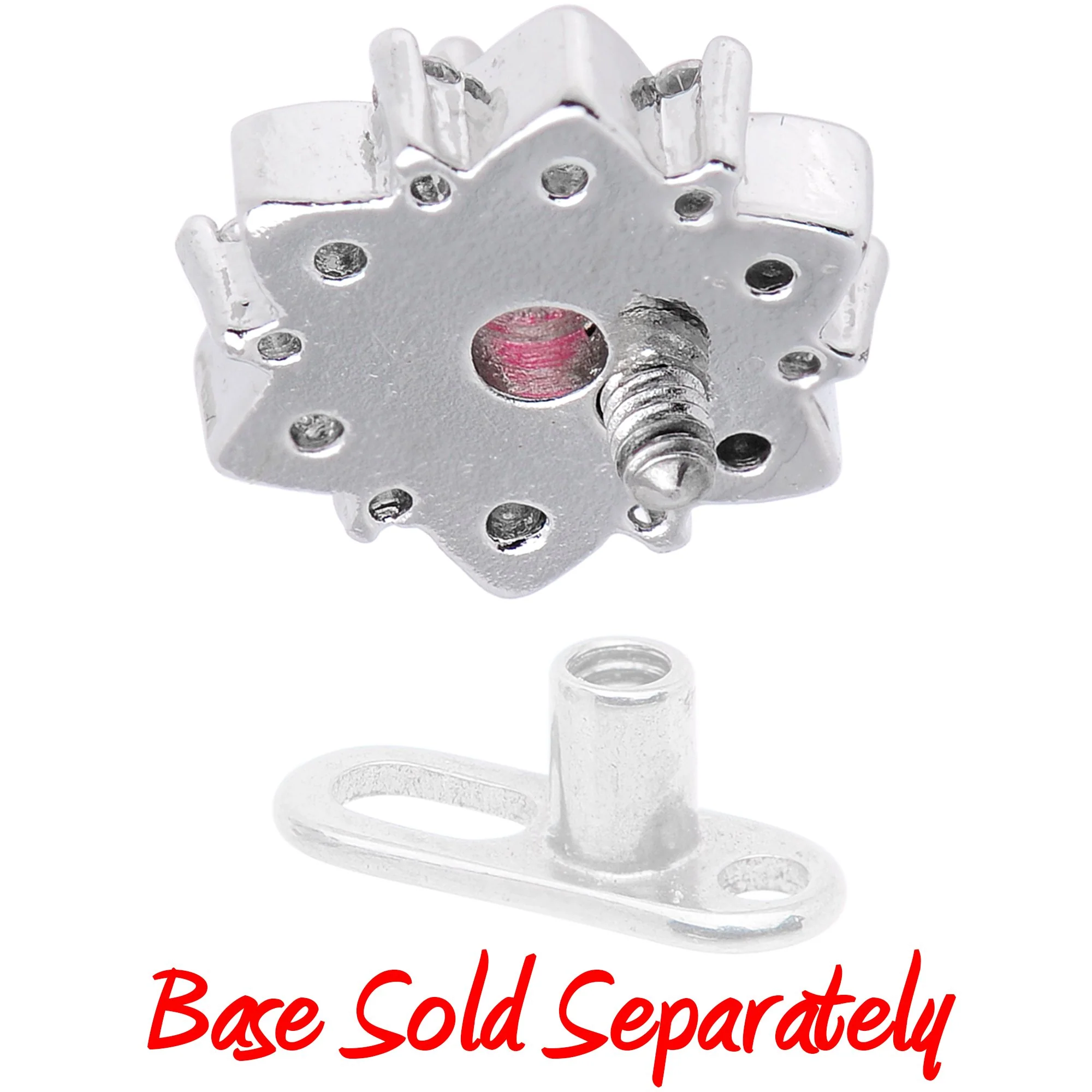 Watch your dermal piercing burst into bloom with this stunning 14 gauge dermal top! The externally threaded dermal jewelry is 5/16" and made with durable 316L surgical grade stainless steel. It features a flower-shaped base set with clear cubic zirconia gems and crowned at the center with a stunning pink faux opal. The contrast of colors makes for an eye-catching piece that is guaranteed to give some glamour to your gear.Specifications