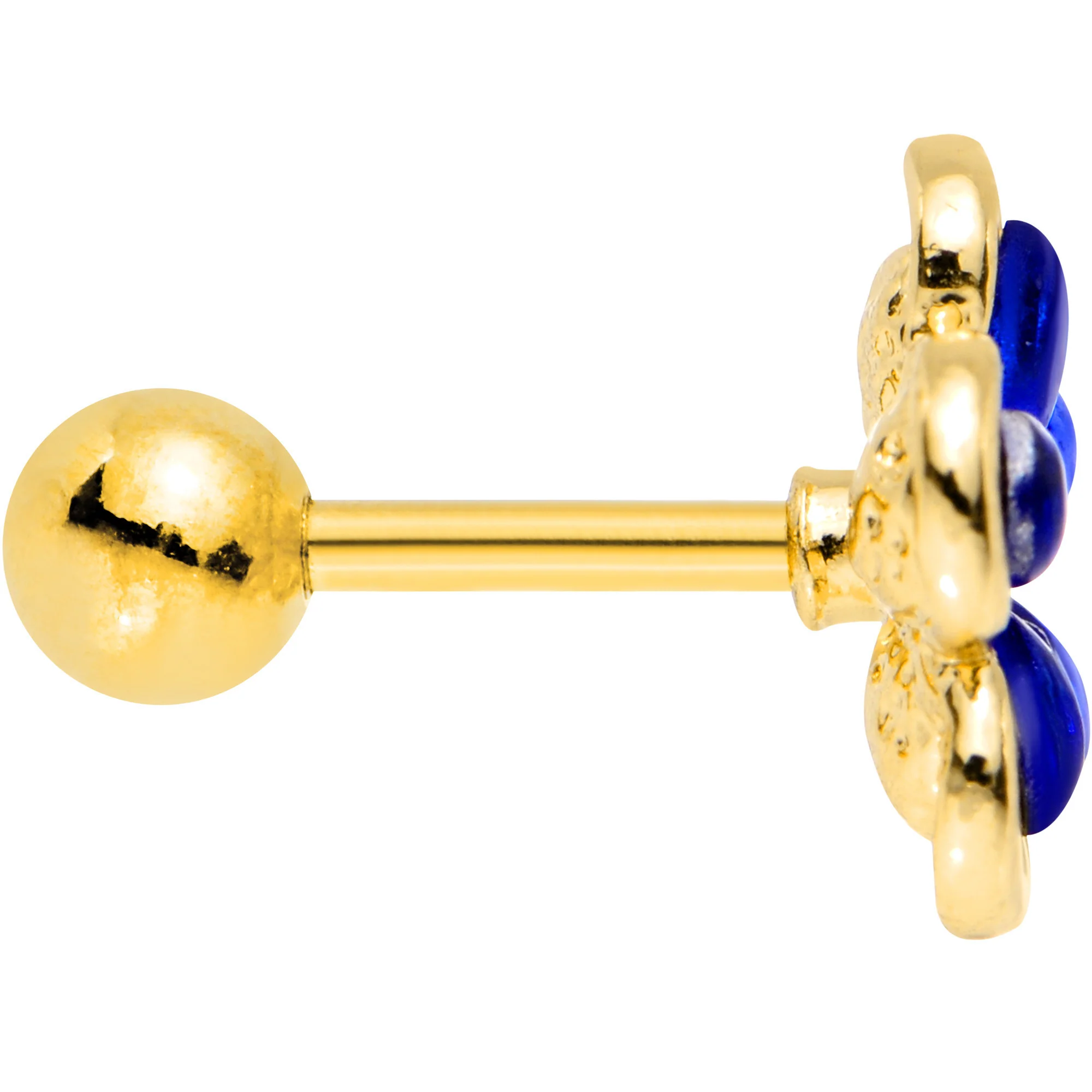 Pick yourself a flower for your ear - this one won't wilt! This 16 gauge tragus cartilage earring featured a beautiful blue flower design set at the top of the 6mm length straight barbell made from gold PVD over durable 316L surgical grade stainless steel. Just fasten the 4mm ball end and you'll have floral style for any season that can be used for a variety of different types of cartilage ear piercings.