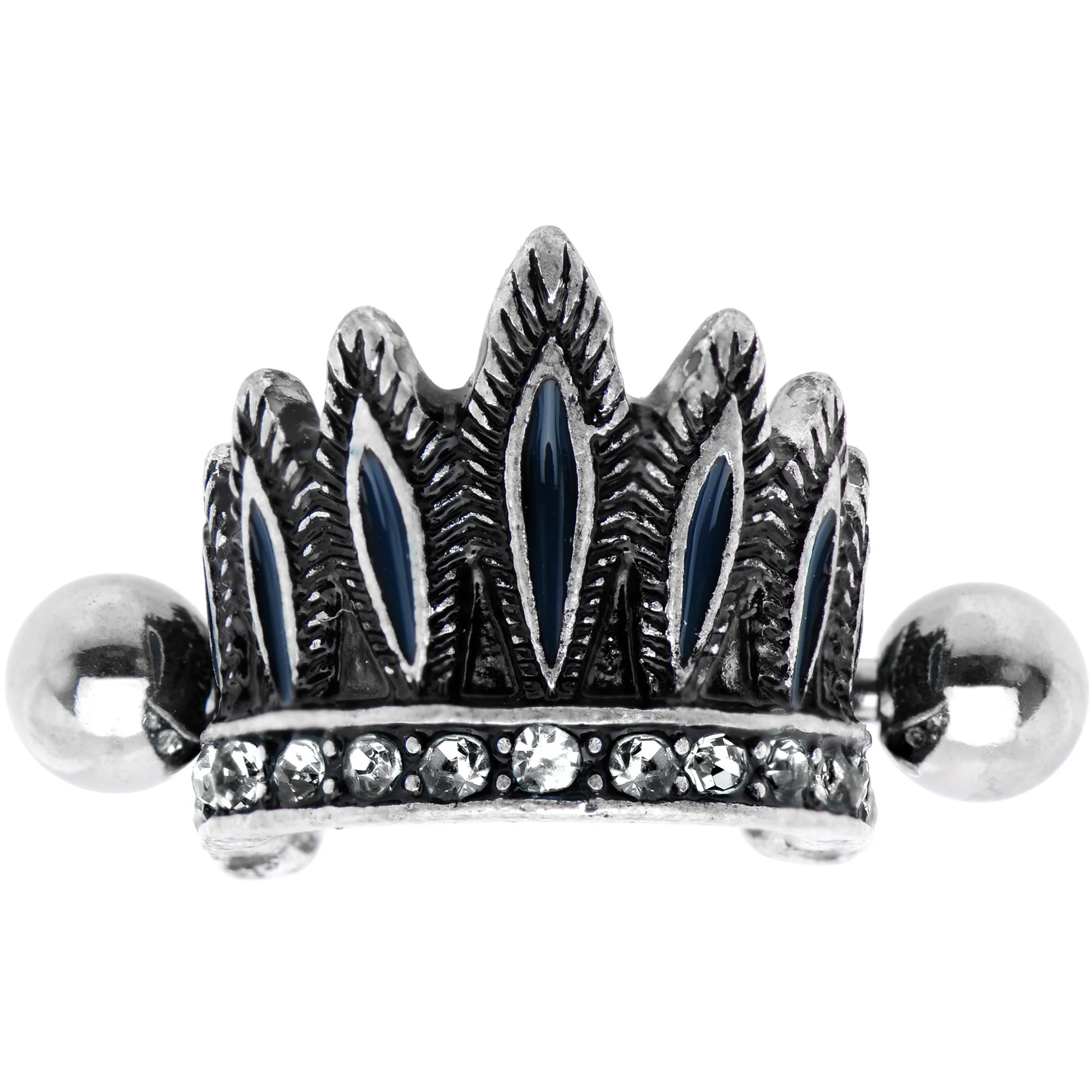 Want an ear cuff look for your cartilage piercing? Well, we've got you covered with this 16 gauge helix cartilage earring. The 6mm length straight barbell is made from durable 316L surgical grade stainless steel and includes 4mm ball ends for securing the cuff jewelry in your piercing. The fancy cuff design that hangs on the side of your ear features a silver plated tribal feathered headdress that has clear gems highlighting the regal display.