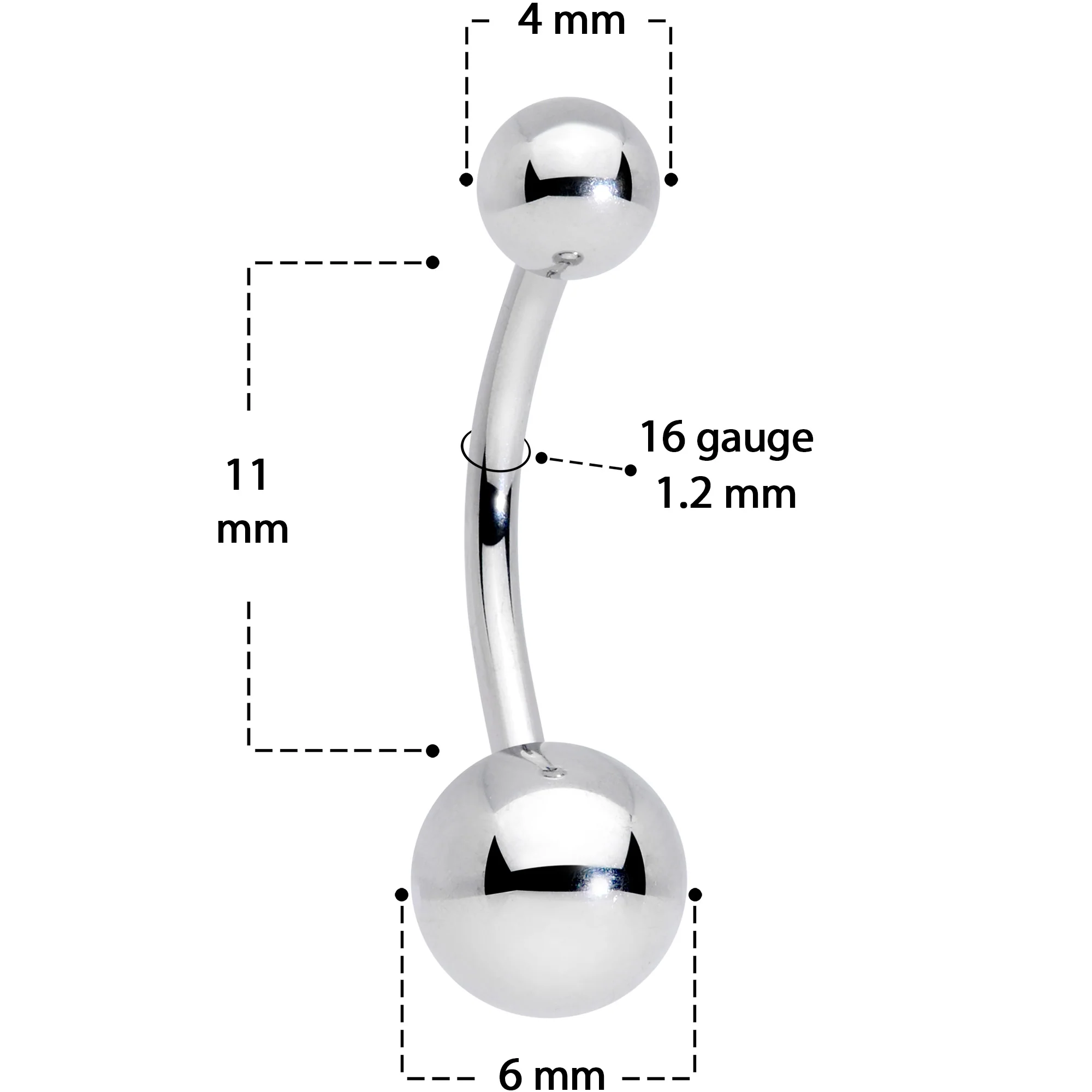 Simple, quality, and simply quality - get it all in this 16 gauge cartilage ring! It's made with an 8mm solid grade 23 implant grade titanium curved barbell with a 4mm top ball end and a 6mm bottom ball end. This cartilage jewelry can do it all - it works in stretched lobes, some eyebrow piercings, some anti-tragus piercings, some tragus piercings, some conch or helix piercings, or as a navel ring. High quality and low frill, this mighty barbell has everything you need!Specifications