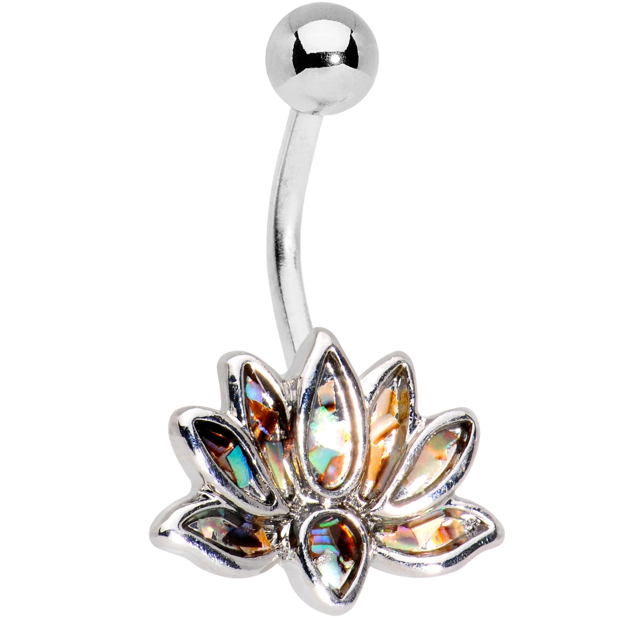 Get in touch with your zen side with this pair of belly rings! Mix and match with these belly rings featuring an iridescent lotus flower charm and an ancient Buddha-inspired charm. Both charms are mounted on a 7/16" durable 316L surgical grade stainless steel curved barbell. Expand your jewelry collection with these awesome 14 gauge belly rings! Sold as a set of two.